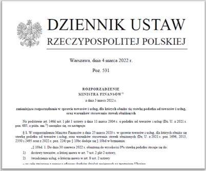 W Dzienniku Ustaw pod pozycją 531 opublikowano Rozporządzenie Ministra Finansów z dnia 4 marca 2022 roku zmieniające rozporządzenie w sprawie towarów i usług, dla których obniża się stawkę podatku od towarów i usług, oraz warunków stosowania stawek obniżonych.